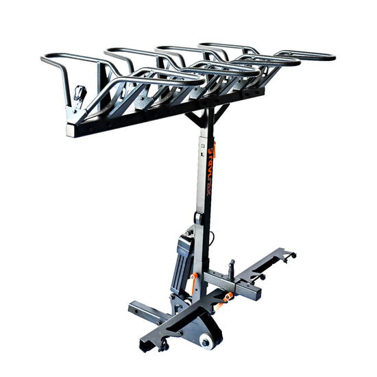 The RevlRax 4 with Fixed Bottom Bar and Straight Hitch redefines adventure-ready bike transport. Perfect for your crew! The fixed bottom bar is the standard option where outward swinging van doors or mullet bikes (different sized wheels) aren't part of the equation. The straight hitch works perfectly when a hitch is higher than 18 inches off the ground. This is for lifted trucks and many SUVs to help you roll your bike straight into the basket, not overhead pressing your burly E-bike into the air!